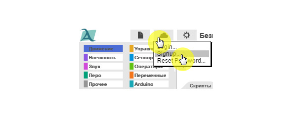 Второй способ – сохранение проектов в облаке. Это удобно тем, что вы получаете доступ к своим проектам из любого компьютера, подключенного к интернет. Также вы можете поделиться своим проектом, размещенным в облаке (расшарить его). Для получения возможности сохранять проекты в облаке необходимо зарегистрироваться. Для этого нажмите на кнопку с облачком в строке меню, и выберите Signup.