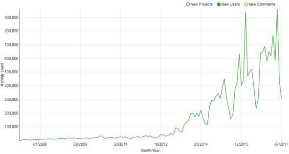 Количество новых пользователей, зарегистрированных на сайте Скретч, непрерывно возрастает. Это означает, что все большее количество школ во всем мире используют Скретч в образовательном процессе.