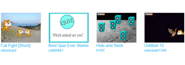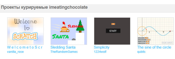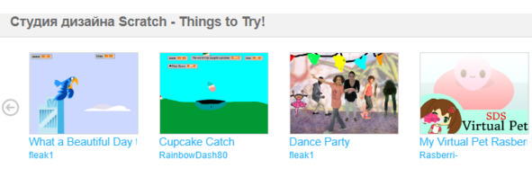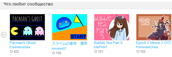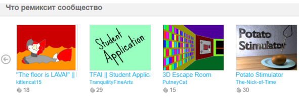 Следующая лента содержит проекты, которые «ремиксит сообщество». Ремикс – это копия чужого проекта с некоторыми изменениями. Значок спирали с числами показывает количество ремиксов проекта.