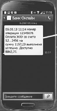 Перед окончанием произведения оплаты на ваш телефон придет пароль из вашего банка для подтверждения операции, обычно это несколько цифр, которые вы вводите в появившееся окошко и нажимайте «Отправить», после чего вас оповестят, что «Оплата прошла успешно». Или – «Статус платежа – успешно», внизу может стоять и печать банка. На сотовый телефон придет и два sms-сообщения, что с вашей карты списана такая-то сумма и что ваш счет оплачен (рис. 21):