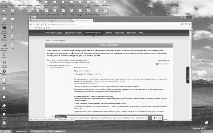 Здесь вам предоставят услугу согласования переустройства и (или) перепланировки жилых и нежилых помещений в многоквартирных домах и жилых домах. Для этого нужно подать заявление (рис. 49).