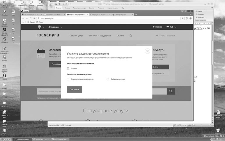 В строке «Вы можете изменить регион» нажмите «Выбрать вручную» и в пустом окне напишите свой город – Новокуйбышевск. Сверху тотчас автоматически выпадет строка с его названием. Внизу нажмите «Сохранить». Теперь на синей полосе стоит название вашего города – Новокуйбышевск. Рядом – российский флаг, который указывает, что вы работаете на русскоязычной клавиатуре (рис. 53).