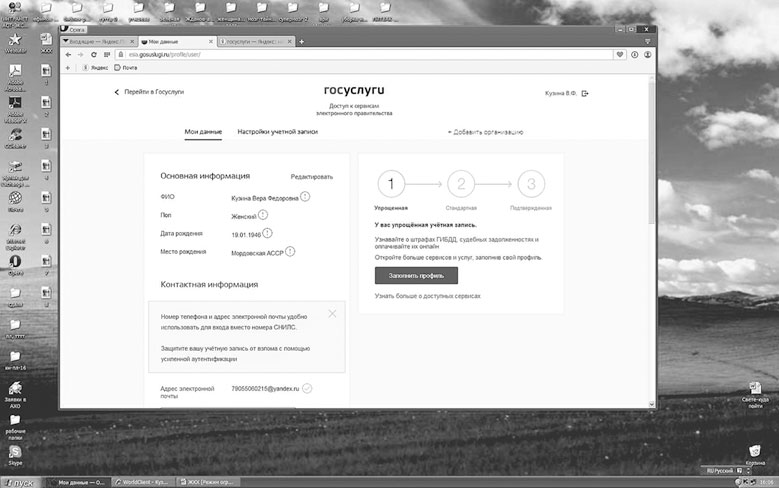 Далее наверху слева увидите строчку «Перейти в госуслуги». Жмите на нее, увидите требование: «Подтвердите данные профиля – лично или заказным письмом. Это позволит получить доступ ко всем услугам на портале». Наверху справа вы увидите свою фамилию, имя и отчество – в данном случае «Кузина Вера Федоровна» (рис. 57).