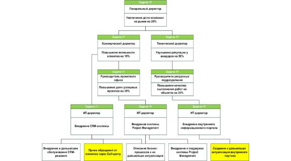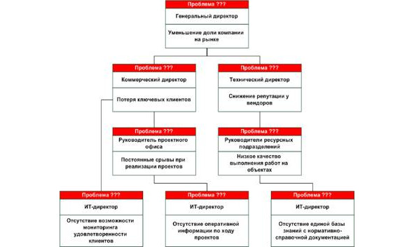 Для понимания проблем бизнеса и перевод их на язык ИТ можно воспользоваться методикой «дерево проблем – решений». Как видно из диаграммы, бизнес формулирует свои проблемы на языке бизнеса. Задача ИТ директора перевести язык бизнеса на технический язык, для дальнейшего формирования ИТ проектов и постановки задач сотрудникам ИТ департамента. Для того, чтобы бизнес и ИТ понимали, что необходимо требовать друг от друга, необходимо определить критерии достижения целей и задач, а также метрики их измерения.