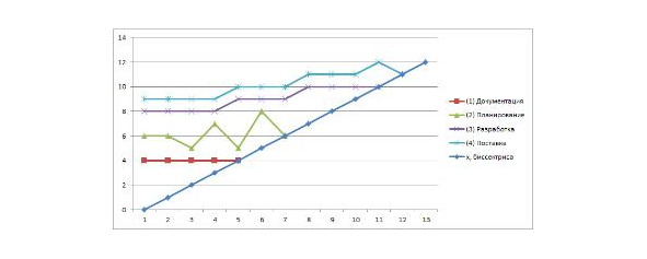 По горизонтали: периоды предоставления отчетности, например, каждую неделю. По вертикале: такая же шкала, с отметками вех. Отметка вех при X=0, соответствует запланированным показателям вех на этапе старта проекта.