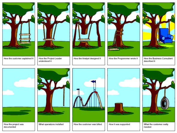 При ведении любого проекта, в том числе и ИТ проекта, наиболее важными элементами являются процесс коммуникации всех вовлеченных подразделений и департаментов. Чем разнороднее участники (финансисты, представители бизнеса, ИТ и т п) тем важнее организовать коммуникацию на «одном» языке для всех участников проектной команды. В противном случае результаты проекта и его этапы могут быть похожи на диаграмму.