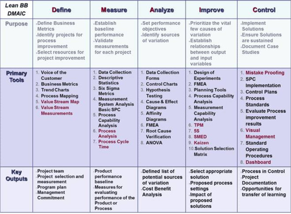 Конечная цель проекта – удовлетворение заказчика качеством продукта, которого можно добиться при помощи непрерывного процесса улучшения всех аспектов проекта, основанном на тщательном анализе показателей. При рассмотрении методологии с точки зрения управления проектами цепочка была предложена цепочка процессов из 5 шагов, известных как DMEDI: