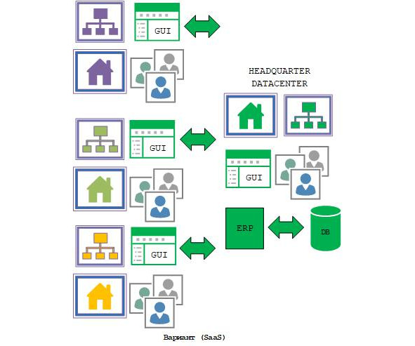 Холдинг предоставляет инфраструктуру дата центра для размещения ИТ систем компаний в нем. В качестве бизнес системы выбирается единая платформа приложения и база данных. Все предприятия используют единую платформу в рамках портфеля или группы компаний, объединённых схожей деятельностью (сельское хозяйство, производство, строительство и т п).