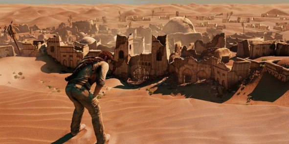 Еще одним примером служит Uncharted 3: Drake’s Deception (2011, Naughty Dog), в которой главный герой, пережив крушение самолета в пустыне, блуждает по дюнам в поисках оазиса. После долгих скитаний он из последних сил взбирается на бархан, где с удивлением обнаруживает красивейшую панораму старинного заброшенного города, утопающего в песках.