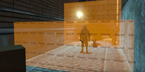 На изображении ниже можно видеть пример триггера из Half-Life 2 (2004, Valve), который привязан к двум событиям на уровне. Стоит только игроку зайти в оранжевую область, как полицейский тут же начинает преследование нарушителя. В случае, если игрок покидает пределы триггера, то персонаж мгновенно прекращает преследование и возвращается на свою исходную позицию.