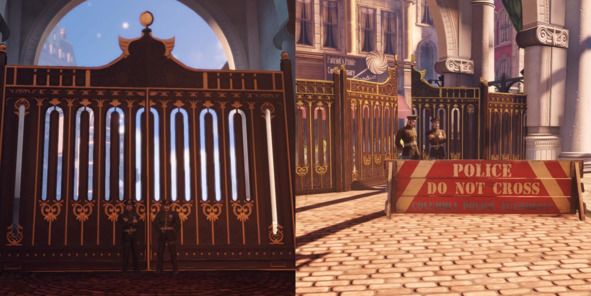Непостоянство масштаба одних и тех же объектов вызывает подсознательное ощущение фальшивости окружения. Например, практически на каждом уровне из BioShock Infinite (2013, Irrational Games) можно встретить одну и ту же модель ворот с позолоченными узорами. Непостоянство масштаба выдают персонажи, по сравнению с которыми ворота выглядят очень странно. В одном случае их размер просто огромен, а в другом подозрительно мал.