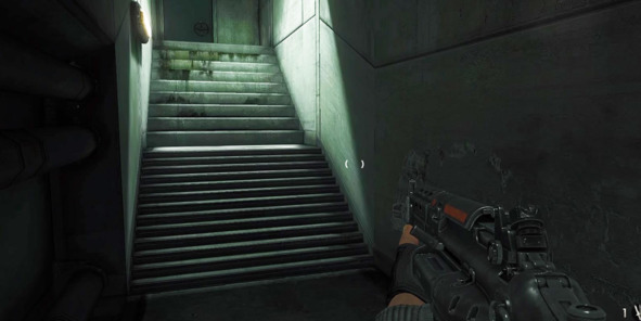 Рассмотрим еще один показательный пример непостоянства масштаба на примере Wolfenstein: The New Order (2014, MachineGames). Если внимательно посмотреть на изображение ниже, то можно заметить, что разница в масштабе ступенек сразу же бросается в глаза.