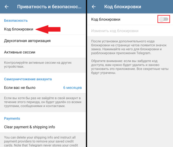 Нажимаем Меню, нажимаем Настройка, Приватность и безопасность, далее Код доступа (переключатель вправо), ввод кода.