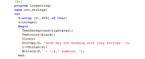 Далее, производится операция присвоения значений массива S переменной LongS и ее последний символ помечается символом завершения строки «#0».