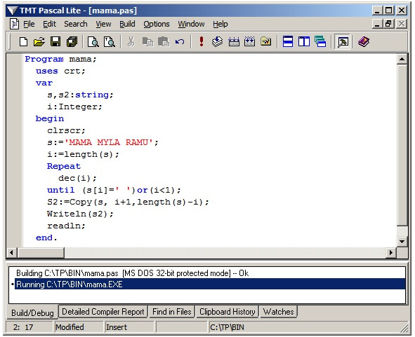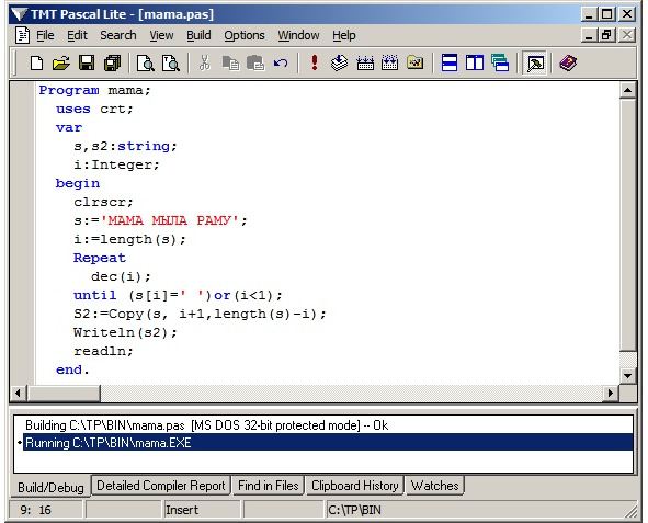 Так, в упомянутой строке S [1] =«М», S [2] =«а», s [3] =«м» и т. д. Зная общее число символов с помощью функции length (S) мы можем перебором достигнуть нужного нам символа в цикле и после произвести нужную операцию. В следующей программе мы получаем последнее слово, благодаря перебору символов с «хвоста», уменьшая значение, полученное из длины строки оператором Dec (i). Так же, на всякий случай мы уточняем условие выхода из цикла в случае, если пробел так и не будет достигнут (i <1).