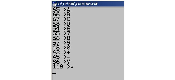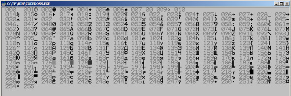 Так мы выводим значения таблицы символов ASCII в DOS-кодировке, кроме управляющих символов с кодами «11» («vertical tab»/ «вертикальная табуляция»), «12» («form feed»/ «смена страницы») и «13» («Enter»). Также был «испорчен» управляющий символ «8», равнозначный команде удаления предыдущего символа с клавишей «Backspace».26