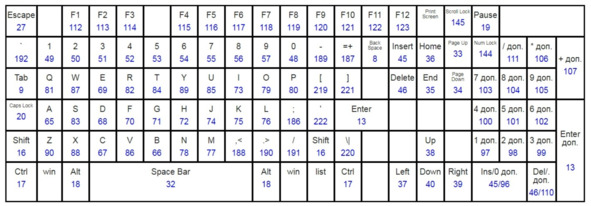 Для простоты восприятия на рисунке ниже представлена нумерация кодов клавиш стандартной клавиатуры «QWERTY».