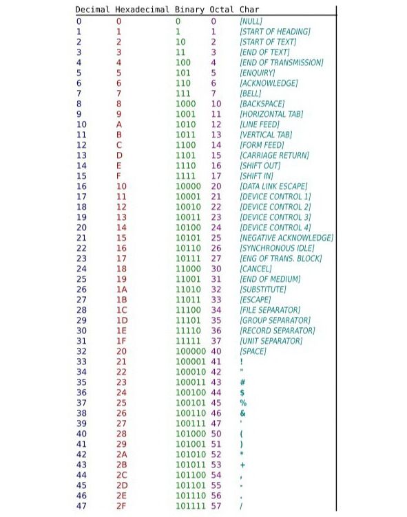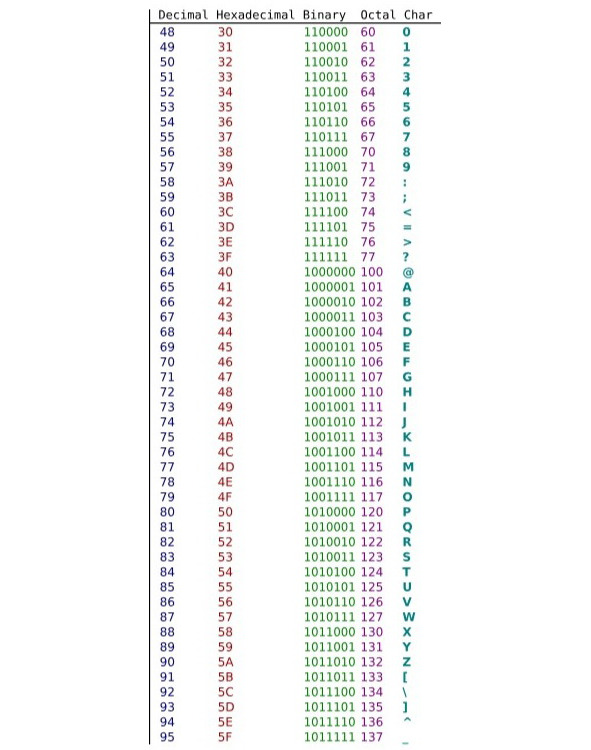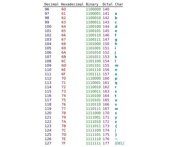 На следующем рисунке приведена базовая кодировка ASCII в двоичном, восьмеричном и символьном коде без использования дополнительных языков.