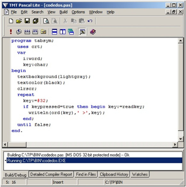Строка «If keypressed=true» – «Если нажата клавиша», то переменной «key» присваивается символ нажатой клавиши «readkey». Затем, мы выводим на экран значение символа в таблице (функция ord) и сам символ (key).