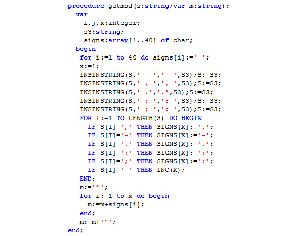 Здесь мы берем исходное предложение и (на всякий случай) предварительно исправляем наиболее распространенные ошибки: наличие пробела перед символами пунктуации, с помощью ранее описанной процедуры insinstring. Далее поработаем с элементами массива signs, в котором будем хранить символы пунктуации на время обработки.