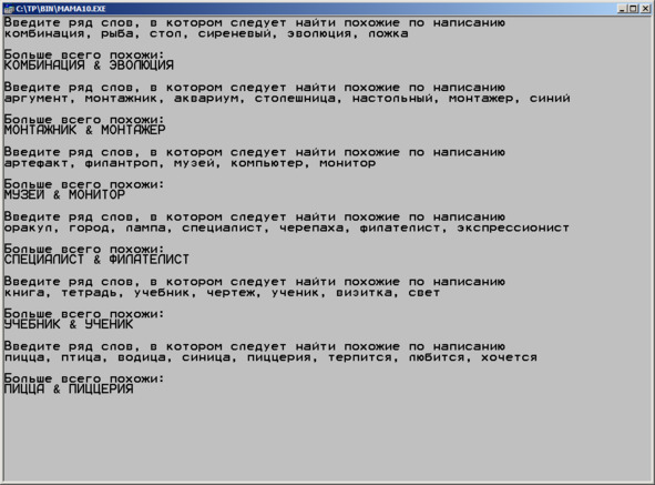 Илл. 36. Тест игры в слова, где из ряда слов, введенных пользователем компьютер выбирает два, наиболее похожих по написанию.