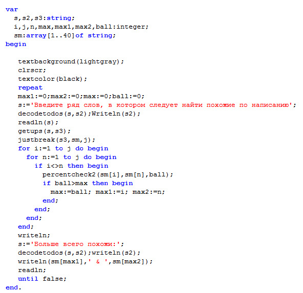 После нормализации (декодирования) приветственной фразы «Введите ряд слов, в котором следует найти похожие по написанию» и выведении ее на экран, от пользователя получается строка S, в которой он написал ряд слов. Эту строку мы разбиваем процедурой justbreak на массив слов sm с известным числом элементов j, после чего в двух циклах последовательно сравниваем (с помощью percentcheck2) различные элементы массива друг с другом, если речь не идет об одном и том же элементе (i <> n). Если текущий максимум Max оказывается ниже текущей оценки Ball, мы передаем число Ball в Max, и запоминаем позиции I и N, сохраняя их в переменные max1 и max2 соответственно. После окончания циклов сравнения мы выводим результат из массива sm с индексами max1 и max2 и ждем следующее задание.
