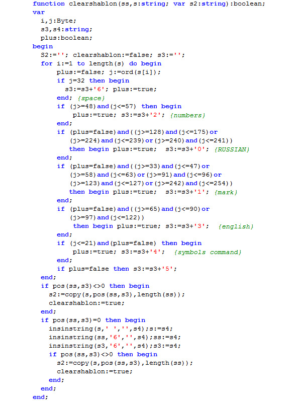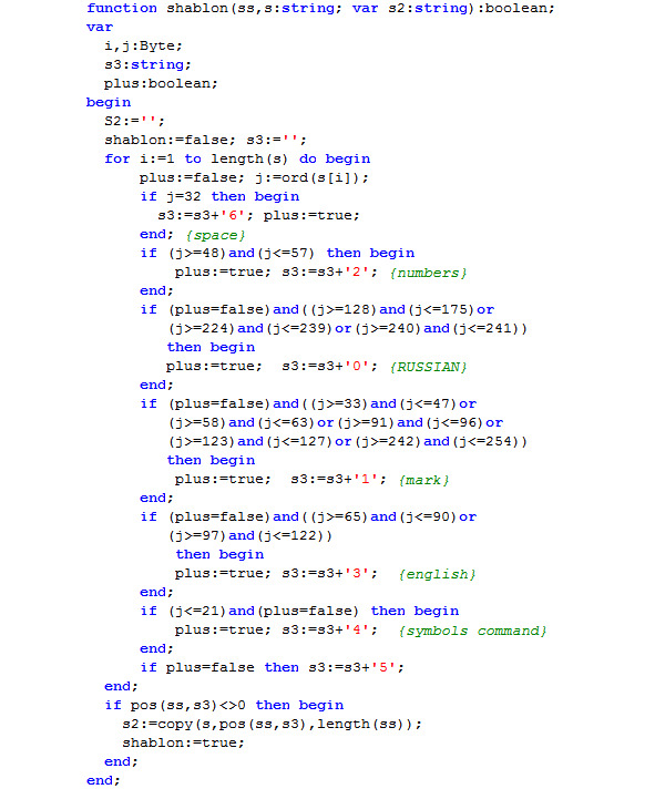 Как видно, функция довольно проста, но здесь были использованы некоторые жизненные «лайфхаки». Поскольку бывает довольно сложно проконтролировать всю палитру диапазонов таблицы символов, здесь введена дополнительная переменная логического типа «plus», которая содержит информацию, об использовании очередного символа из строки в шаблоне. Если мы пропустили какой-то символ (if plus=false) после проверки всех полезных для нас вариантов, тогда мы добавляем символ кода «5» в S3 (там может оказаться псевдографика, командные символы и т.п.). В таком случае длина строки, содержащая код шаблона S3 не будет отличаться от исходной S. Также, для того, чтобы каждый раз не проверять код текущего символа из исходника S, мы присвоили его значение переменной j, что ускоряет время исполнения.