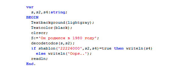 По окончании кодирования строки, мы выполняем поиск подстроки SS в полученной строке S3, и копируем фрагмент из реальной строки S с позиции строки полученного шаблона S3 и с длиной подстроки шаблона SS. Фрагмент «S2:=copy (s, pos (ss, s3), length (ss));»