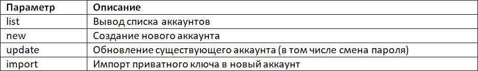 Команде geth account можно передавать параметры, перечисленные в табл. 4.1.