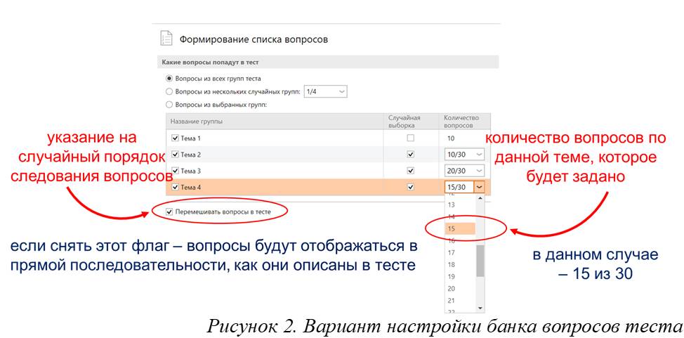Один из распространенных приемов реализации выборочного контроля знаний с сохранением репрезентативности контроля по всем изученным темам – это формирование «банка» (или группы) вопросов для каждой темы с последующей случайной выборкой определенного количества вопросов из каждой группы.