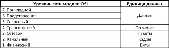 Эталонная модель OSI определяет широкий список функций и сервисов, реализуемых на каждом уровне. Кроме того, она описывает взаимодействие каждого уровня с вышестоящими и нижестоящими уровнями. Всего модель насчитывает семь уровней. На рисунке 4 представлен стек модели OSI с указанием единицы данных, с которым работает каждый из уровней.