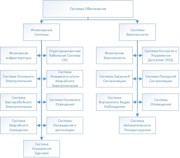 Системы обеспечения можно условно разделить на две составляющие: Инженерные системы и Системы Безопасности. Первая группа предназначена для обеспечения функционирования ИТ инфраструктуры. Вторая группа обеспечивает физическую безопасность ИТ инфраструктуры. При построении ЦОД желательно придерживаться рекомендаций следующих стандартов:
