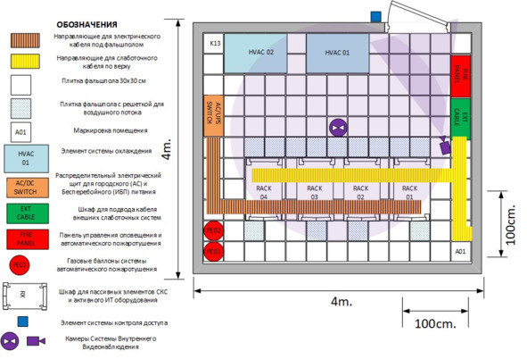 •Обеспечивать возможность размещения шкафов (форм-фактор 42U 600 х 1100 х 2000 мм) и их обслуживание;