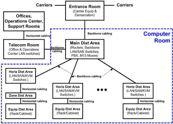•Машинный зал (Computer Room CR) – включающие в себя Zone Distribution Area ZDA и Equipment Distribution Area EDA;
