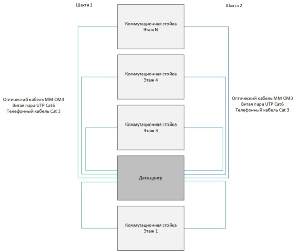 Вертикальная составляющая СКС предоставляет из себя подключения между точками «распределения». К таким соединениям относятся соединения между зданиями, между серверной комнатой и этажным коммуникационным шкафом и т п.