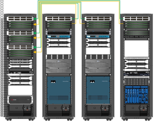 Первая стойка служит у нас коммутационной. К ней подводится кабель от патч-панелей (одна 48-ми портовая Cat6 и три 24-х портовые оптические) второй, третьей и четвертой стойки. Здесь же размещаем 16-ти портовый KVM-коммутатор, монитор и клавиатуру для физического доступа к серверам. Также размещаем физический, корневой сервер центра сертификации, физический сервер контролер домена, два хоста гипервизора, и Систему Резервного Хранения Данных. Следующие две стойки имеют идентичное активное оборудование, чем обеспечивается отказоустойчивость на уровне стойки. В качестве активного оборудоования устанавливаются корневой коммутатор, Система Хранения Данных, хост гепервизора и хост СУБД, файрвол и устройства защиты почтовых сообщений. Четвертая стойка может использоваться для размещения телефонии, оборудования депаратмента безопасности, патч-панели приходящии от этажных коммутационных стоек и т п. В первых трех стойках имеется запас для размещения дополнительного активного оборудования размером от 10U до 18U).