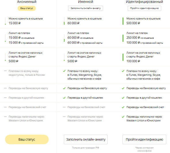 На Яндекс. Деньги для пользователей предусмотрена возможность выбрать один из трех статусов: анонимный, именной, идентифицированный. Анонимный статус присваивается сразу после регистрации в кошельке. Ниже вы видите информацию о том, как можно их получить.