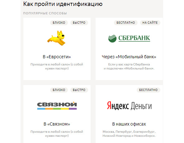 Гражданам других стран свои персональные данные нужно подтверждать иначе. Например, лично явившись в один из офисов Яндекс. Деньги. Варианты представлены на картинке ниже. Выбираете удобный для вас способ и следуете инструкции, открывшейся далее.