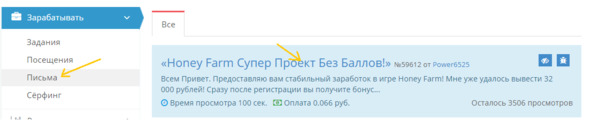 Раздел «Письма» в буксе SocPublic напоминает раздел «Серфинг» в SEO sprint: тоже название, описание, время просмотра, оплата за просмотр и количество оставшихся просмотров.