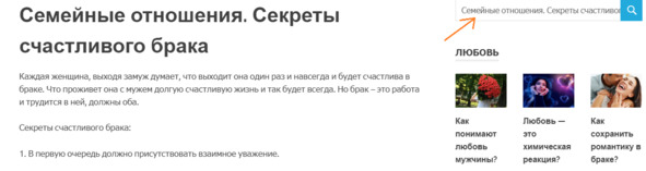 Ищем ответ на первой вопрос в статье «Семейные отношения. Секреты счастливого брака». Можете просто воспользоваться поисковиком сайта (смотрите рисунок ниже), набрав в нем название статьи, а затем нажав кнопку «Читать далее».