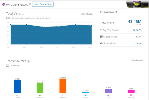 2. Вбейте доменное имя сайта конкурента, нажмите кнопку «найти» и изучите пункт Total Visits (общее количество посетителей). Следует обратить внимание не только на Total Visits, но и на то, откуда приходит трафик: какое количество посетителей сайта пришло из «поисковика», а какое – из других источников. Например, у сайта Wildberries – 31,04% трафика из поисковых систем.