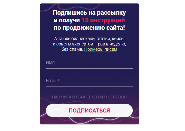 Наверное, это будет самый большой блок про формы. Собирая электронные адреса пользователей, вы можете запустить email-маркетинг и дожимать клиента на покупки. Поэтому если хотите начать работать в этом направлении, то один из важных этапов – получение контактов пользователей.