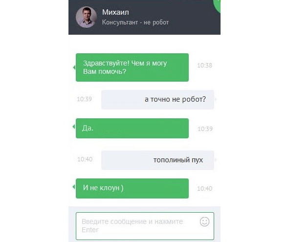 У нас периодически бывают ситуации, когда пользователи до конца не верят, что консультант – это не робот и стараются это проверить всеми доступными способами. Туда входят нелепые вопросы, пароль-проверка, на который робот точно не ответит и многое другое.