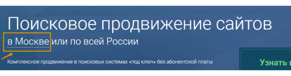 Представим, что некая компания А оказывает услуги по всей России, но, чтобы сделать персонализированное предложение для своих клиентов из разных регионов, она использует подмену города. Как здесь: