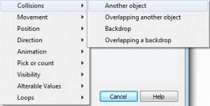 Соответственно в редакторе событий заменим все условия соприкосновения с объектами с Диззи на наш новый прямоугольник. Делаем это просто: в редакторе событий дважды кликаем на иконку Диззи и выбираем вместо него новый объект.