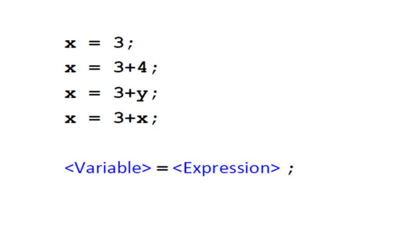 Но сначала, давайте вспомним, что выражение присваивания состоит из переменной, за которой следует символ равенства, за которым следует выражение для вычисления, которое завершается точкой с запятой.
