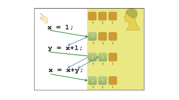 Теперь мы сначала получаем значения x и y, складываем их вместе, получаем 3 и сохраняем 3 в x.
