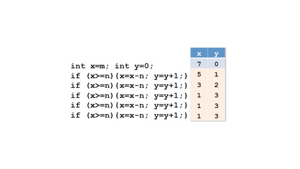 Если x больше или равно n, мы вычитаем n из x и увеличим y на 1.