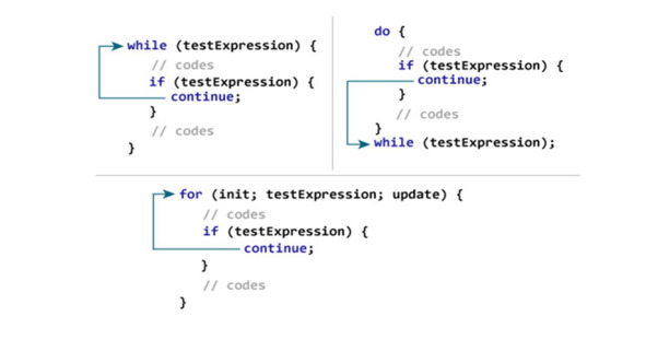 Оператор continue пропускает текущую итерацию цикла и когда выполняется оператор continue, управление программой переходит к концу цикла.