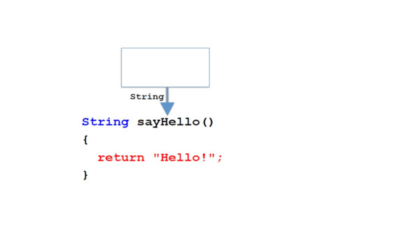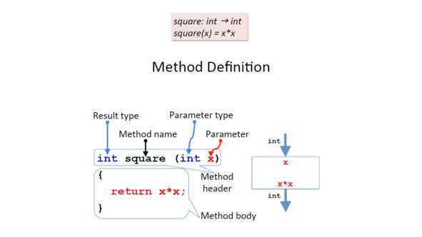 Во-первых, мы пишем тип результата, затем имя метода, а затем в круглых скобках тип параметра и далее идентификатор параметра.